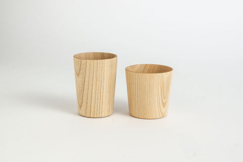 北海道産の「セン」の木を、厚さおよそ2mmまで挽いた木のグラス。軽くて持ちやすく割れにくいのが特長。お酒の他、ドレッシングやジャムを入れたりするのもおすすめです。自然の木材を使用していますので、一つひとつ木目や重さが少しずつ異なります。